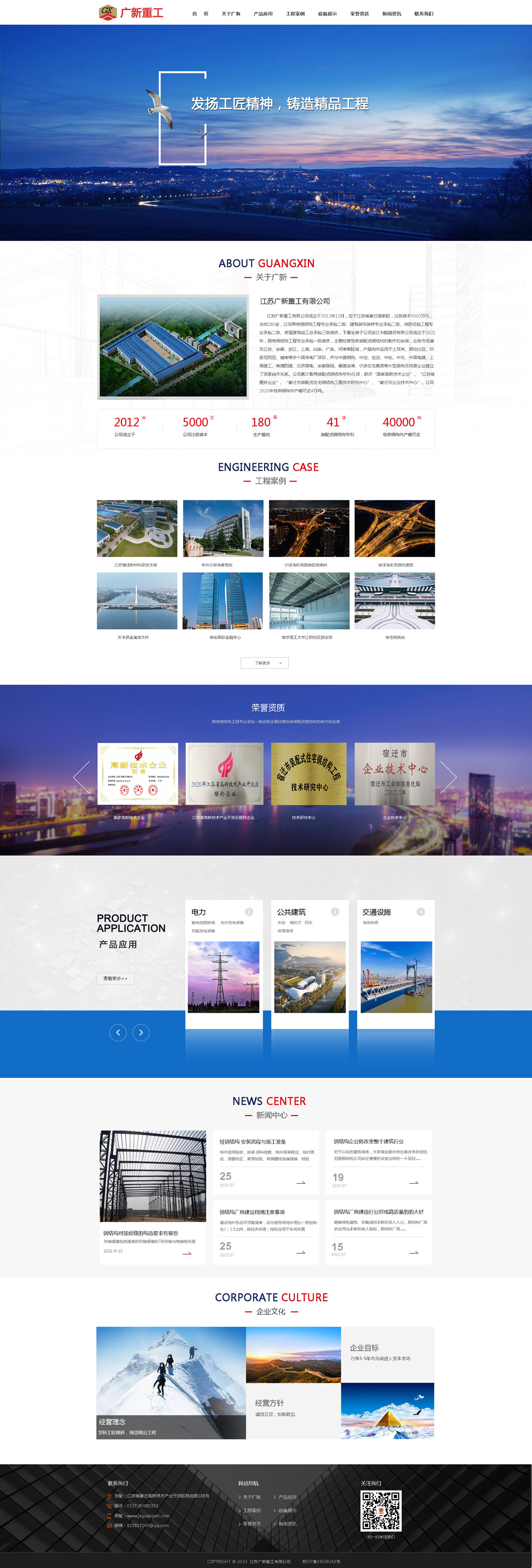 江蘇廣新重工有限公司成立于2012年12月,位于江蘇省宿遷高新區(qū),注冊資本5000萬元,占地180畝,建筑面積4.7萬平方米,主要經(jīng)營各類裝配式鋼結(jié)構(gòu)的制作和安裝,年產(chǎn)各類鋼構(gòu)件6萬噸。公司具有房屋建筑施工總承包二級、鋼結(jié)構(gòu)工程專業(yè)承包二級、建筑裝飾裝修專業(yè)承包二級、消防設(shè)施工程專業(yè)承包二級資質(zhì),下屬全資子公司浙江書韜建設(shè)有限公司成立于2021年,擁有鋼結(jié)構(gòu)工程專業(yè)承包一級資質(zhì),業(yè)務(wù)市場遍及江蘇、安徽、浙江、上海、山東、廣東、河南等區(qū)域,產(chǎn)品構(gòu)件運用于土耳其、哥倫比亞、印度尼西亞、越南等多個國外電廠項目,并與中建鋼構(gòu)、中冶、寶冶、中化、中交、中國電建、上海建工、北京國電、寧波住宅集團等大型國有及民營企業(yè)建立了深度合作關(guān)系。公司累計取得裝配式鋼結(jié)構(gòu)專利51項,獲評“國家高新技術(shù)企業(yè)”、“江蘇省瞪羚企業(yè)”、“江蘇省專精特新企業(yè)”,建有“宿遷市裝配式住宅鋼結(jié)構(gòu)工程技術(shù)研究中心”、“宿遷市企業(yè)技術(shù)中心”,并于2023年12月通過中國船級社(CCS)認證,,2024年10月產(chǎn)品通過歐盟CE(EN1000)標準認證,2024年12月通過美國船級社(ABS)和法國船級社(BV)認證。