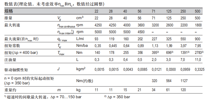A4FM 電機有以下排量尺寸可供選擇:22 | 28 | 40 | 56 | 71 | 125 | 250 | 500 毫升/轉(zhuǎn)。標(biāo)稱壓力為 350 bar,最大壓力為 400 bar。