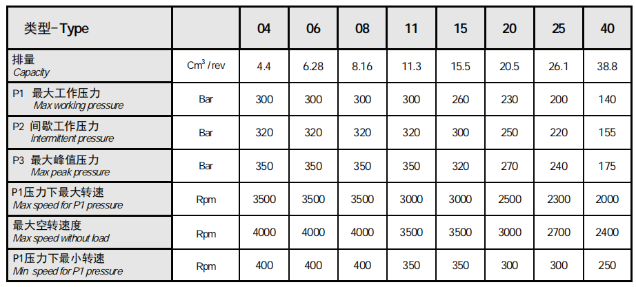 • 容量范圍廣:4-6-8-11-15-20-25-40 cm 3 /rev。