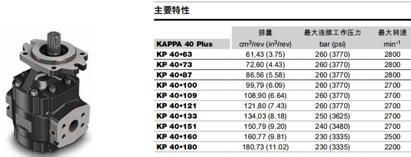 KP40系列齒輪泵的排量范圍廣泛,從61.43 cm3/rev(3.75 in3/rev)到180.73 cm3/rev(11.02 in3/rev),分為40個規(guī)格,滿足不同工況下的需求。其峰值壓力可達300 bar(4350 psi),最高轉速可達2800 min?1,確保了在高壓、高速工況下的穩(wěn)定性能。