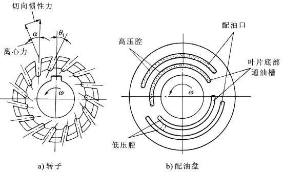 上述工作原理表明,改變定子與轉(zhuǎn)子偏心距的方向也就改變了泵的吸、壓油口,即原來的吸油口變成壓油口,原來的壓油口變成吸油口;改變上述偏心距的大小意味著改變了泵的排量。 當偏心量為零時,密封容腔不會有容積變化,因此也就不具備液壓泵的工作條件了。同樣道理,為了使葉片運動自如、減小磨損,葉片槽通常向后(注意,這里與雙作用葉片泵不同)傾斜20o~30o。 圖3.20為單作用 葉片泵的配油盤和轉(zhuǎn)子結(jié)構(gòu)簡圖。